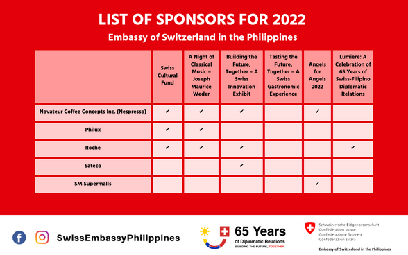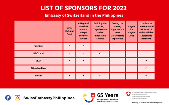In line with the FDFA Guidelines on Partnering with Sponsors to increase external transparency about the partnerships entered into by Switzerland’s embassies and consulates abroad, we are providing a list of the current-year sponsorship partners and the corresponding events.